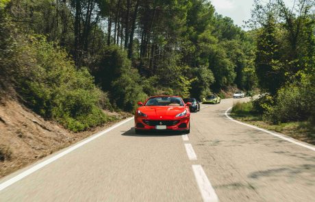 Tras un delicioso desayuno, nos dirigimos a nuestros vehículos seleccionados para la ocasión. Formamos una impresionante caravana, compuesta por el exclusivo McLaren 765 LT, cuatro ágiles y eficientes Porsches (718 Cayman GT4, 992 Carrera S, 991 Mk1 GT3 RS y 991 Mk2 GT3 4.0) y uno de nuestros hermosos Ferrari Portofino M, que destaca por su potencia, su llamativo color rojo y su capacidad de descapotarse.